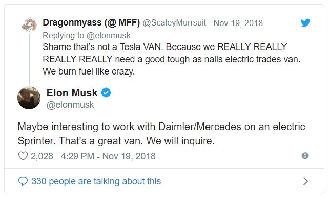 Odpověď Elona Muska: "Možná by bylo zajímavé pracovat s Daimlerem/Mercedesem na elektrickém Sprinteru. To je skvělá dodávka. Prozkoumáme to."